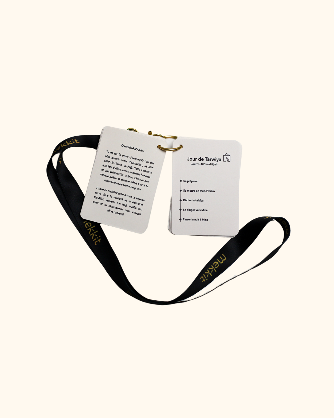 Porté en tour de cou, le Mekkit Hajj vous permet d’avoir à portée de main toutes les invocations et explications nécessaires de la OMRA et du HAJJ, dans un même mekkit sans vous encombrer.